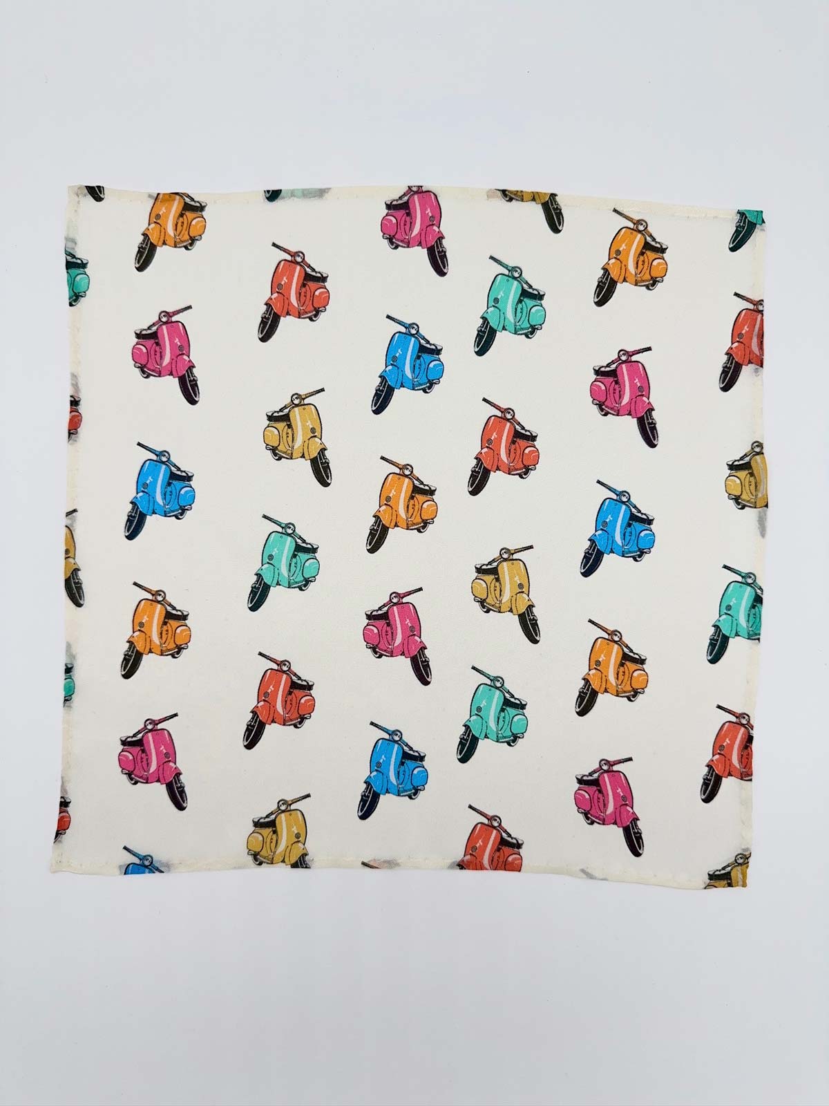 50Specia รจ la pochette piรน ironica e nostalgica della collezione VIES: un richiamo immediato alla libertร , ai pomeriggi dโestate e alle iconiche linee senza tempo della Vespa. Il fondo panna caldo fa da tela raffinata a una serie di scooter multicolore illustrati con tratto fine e stile pop, creando un design vivace ma mai eccessivo.