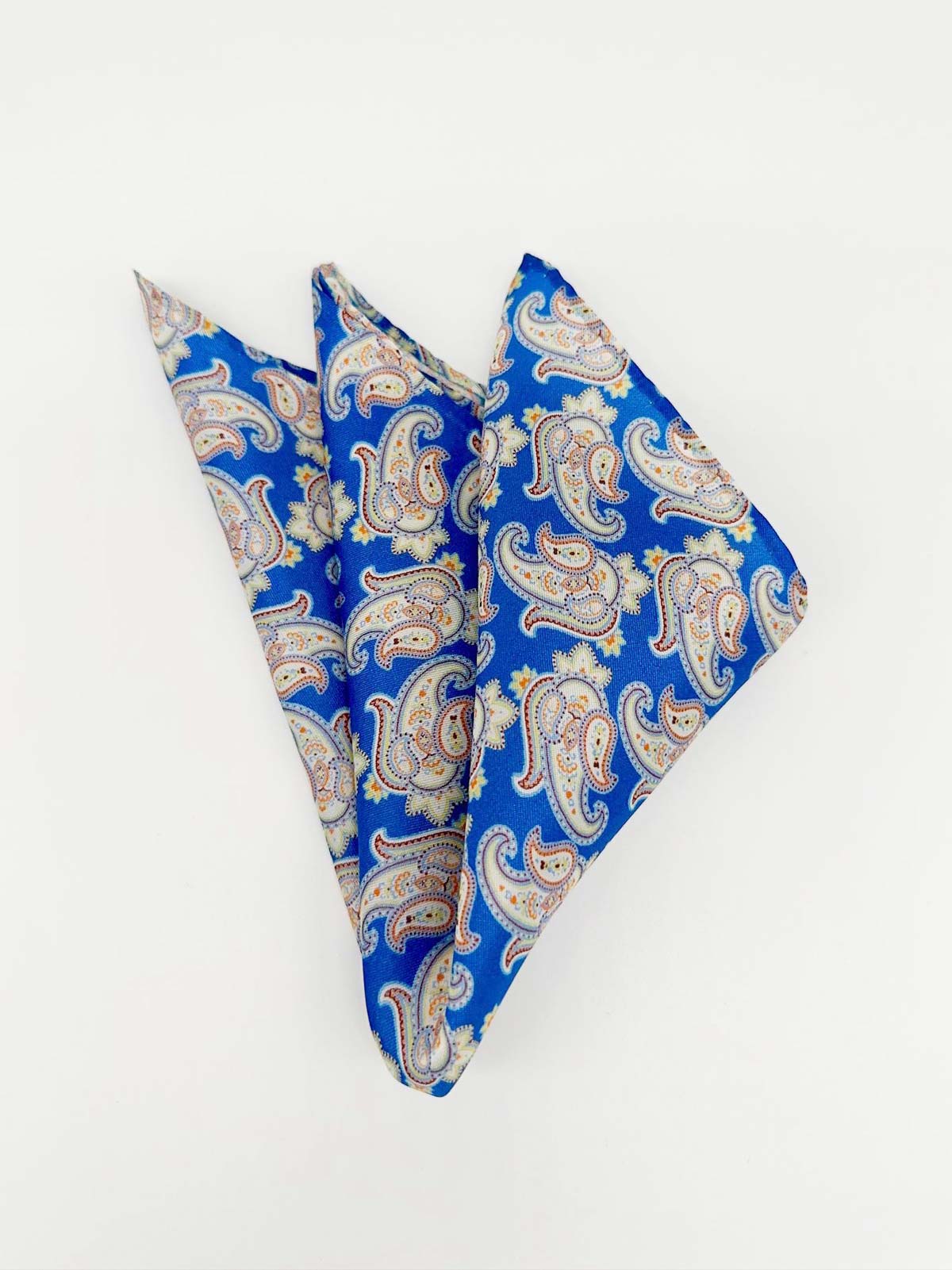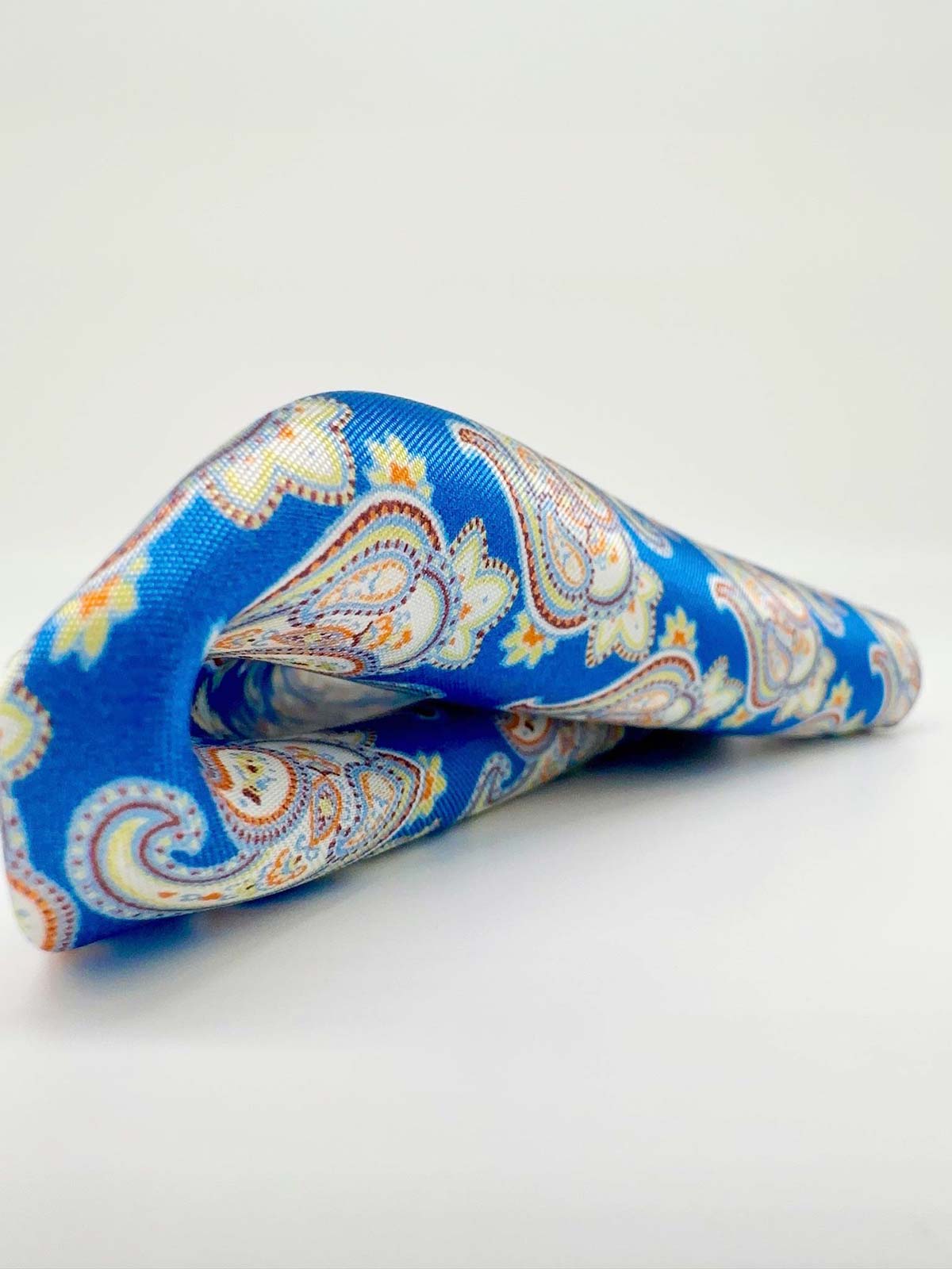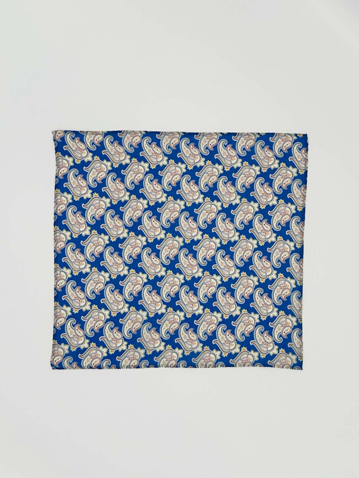 Il fondo blu brillante esalta i ricami paisley nei toni crema, arancio e giallo, creando un effetto vivace ma sempre elegante. Realizzata in Bemberg, è morbida, fresca e perfetta per aggiungere un tocco di colore deciso senza perdere stile.