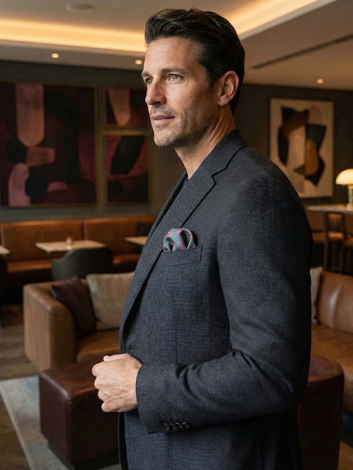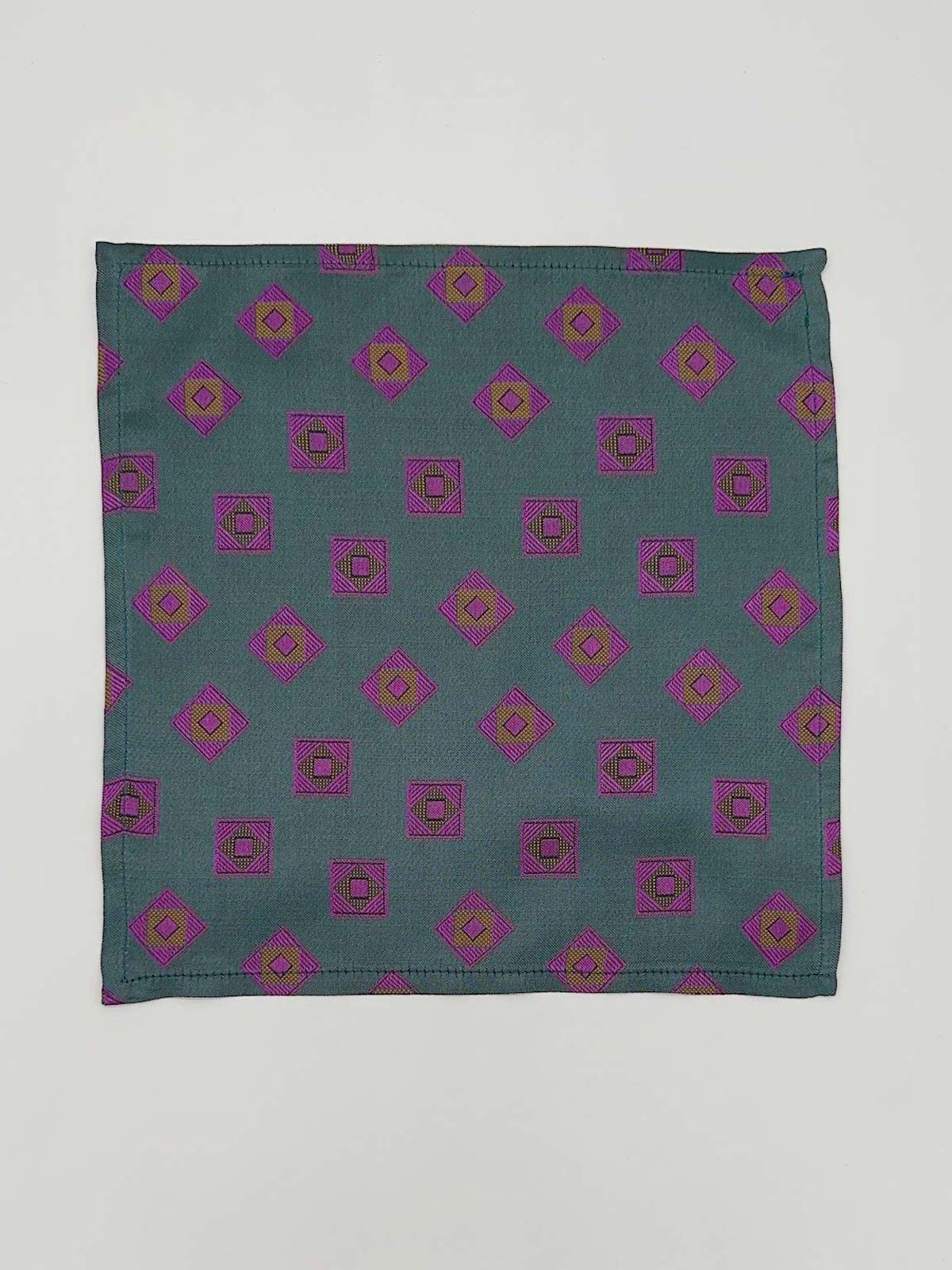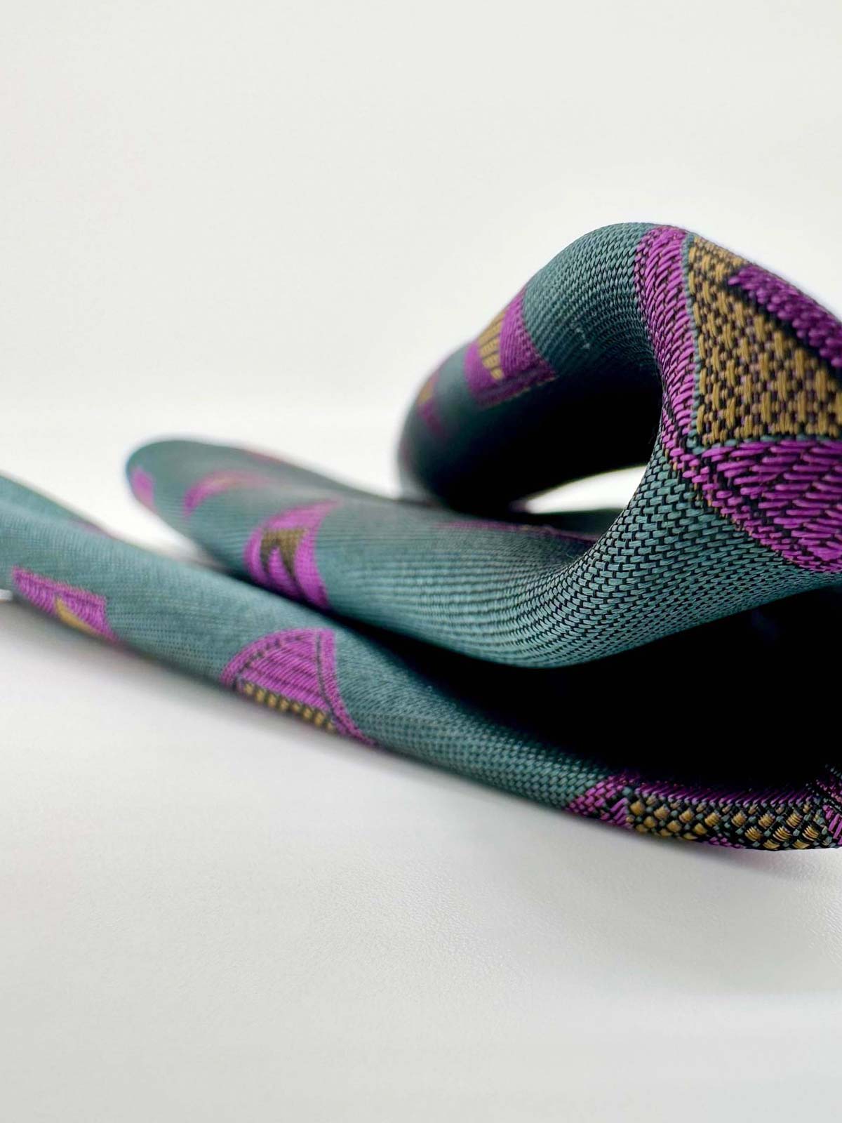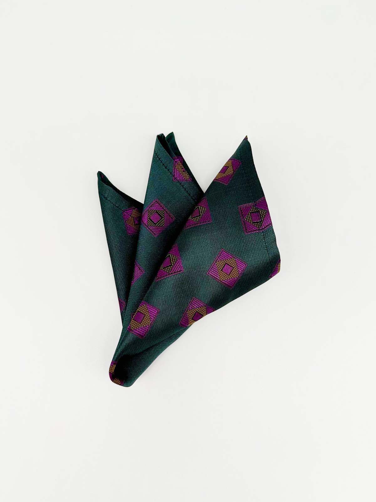 Aubergine P รจ una pochette in seta jacquard dal carattere sofisticato, definita da una base verde petrolio arricchita da un motivo geometrico nei toni del viola e del senape. Il pattern, fitto e regolare, crea un effetto visivo profondo e armonioso, che dona movimento senza risultare eccessivo.