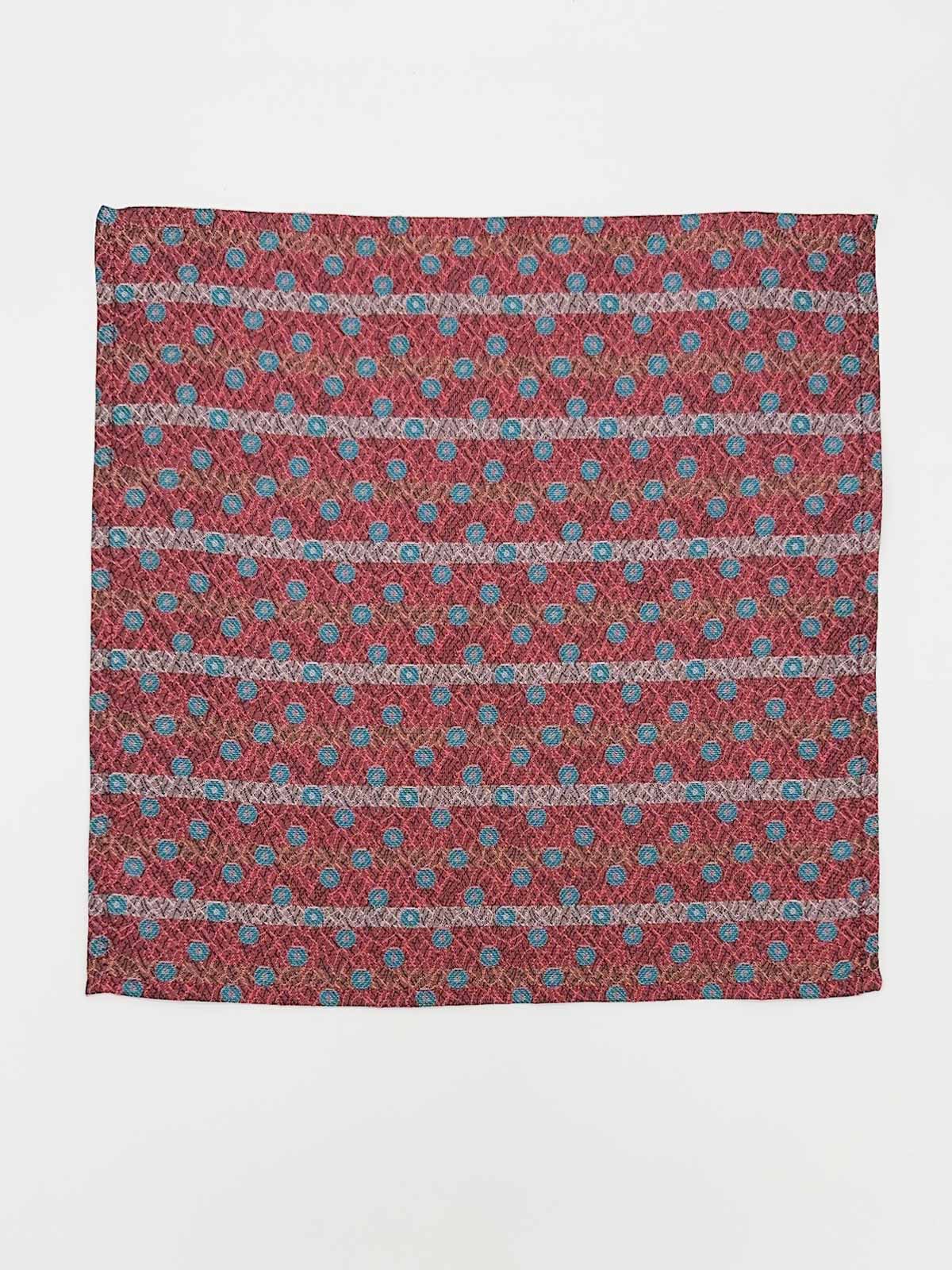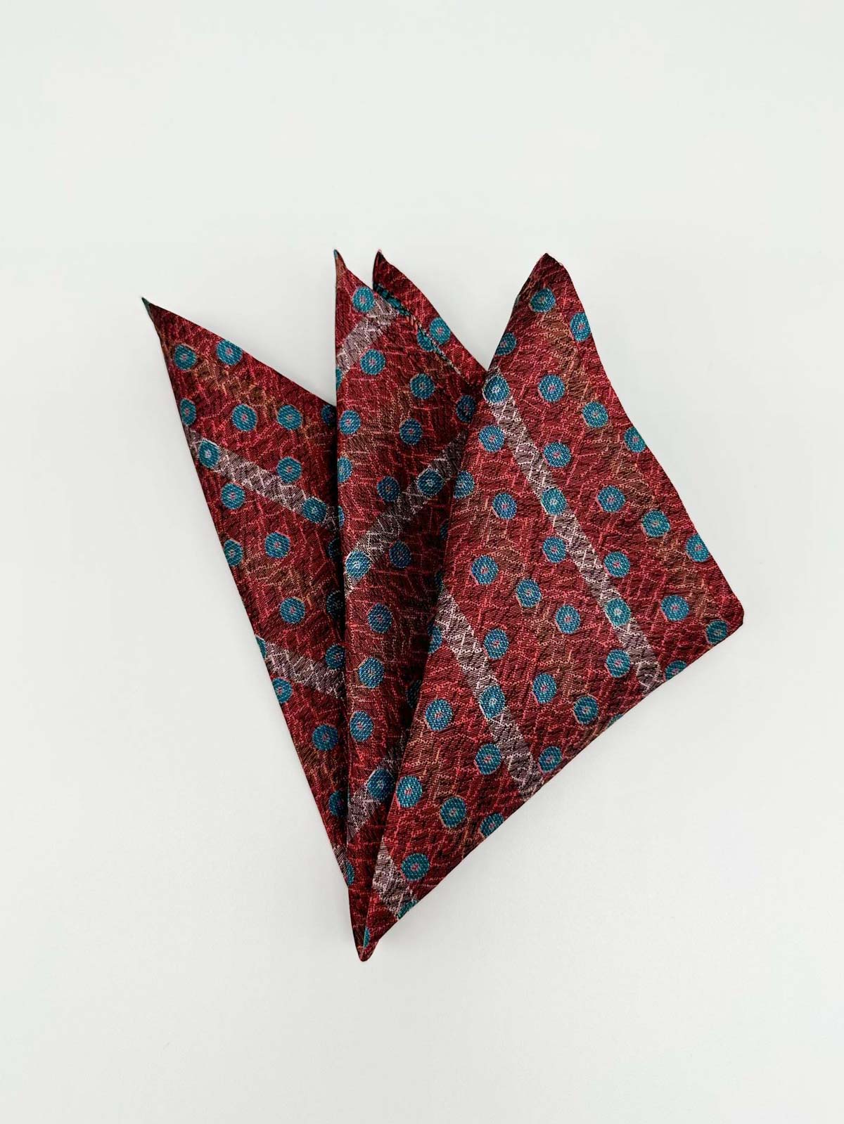 Il fondo rossoโ€“borgogna, attraversato da righe diagonali e micro-pois turchesi, crea un contrasto ricco e vibrante. Il pattern jacquard, con la sua texture intrecciata, aggiunge profonditร  e riflessi sofisticati, rendendo questo fazzoletto un dettaglio che non passa inosservato.