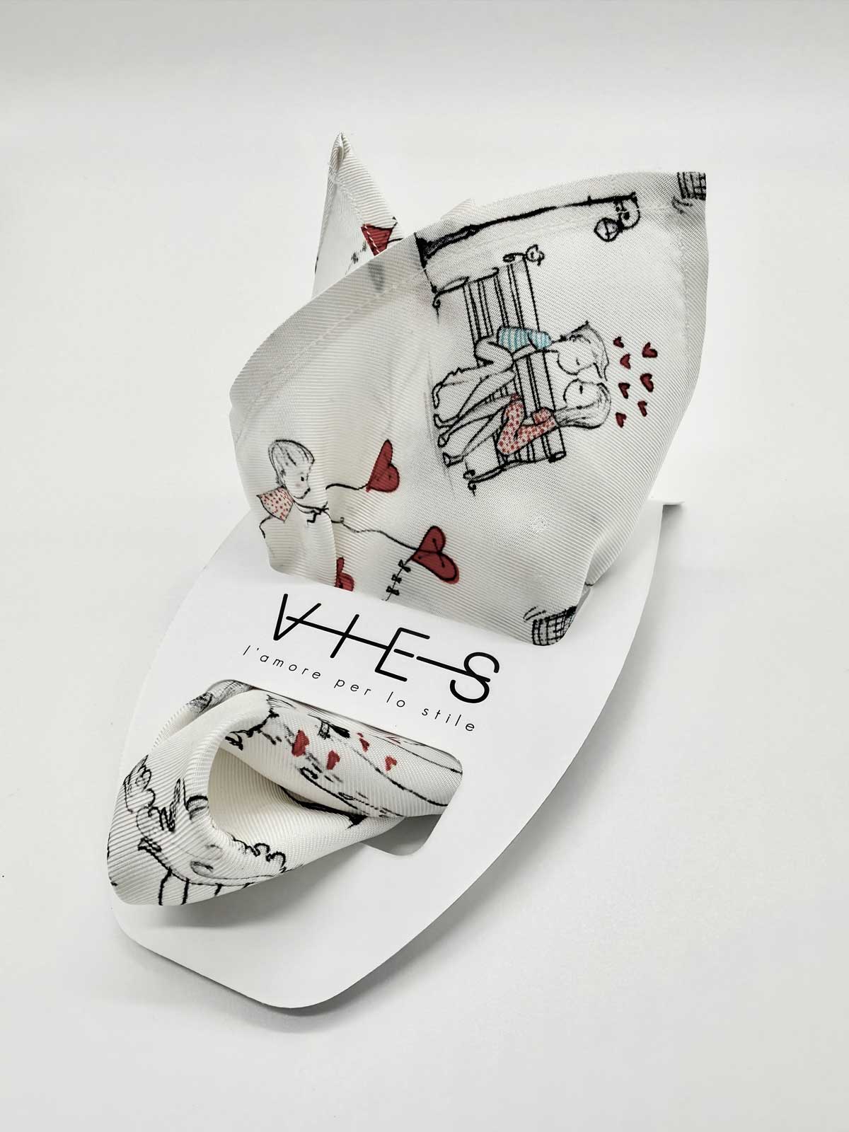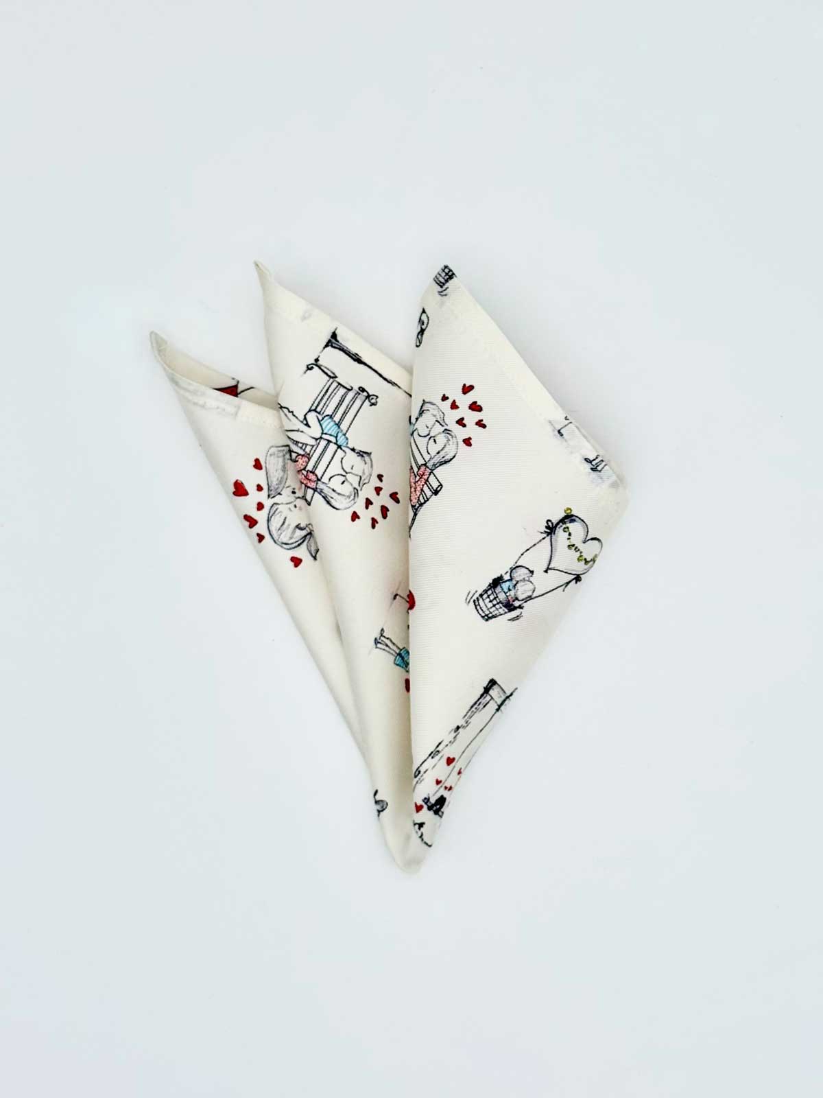 Innamorato è una pochette che racconta l’amore con leggerezza, ironia e un tocco poetico. Il fondo avorio caldo accoglie una serie di illustrazioni delicate e narrative: coppie che si baciano, cuori che volano, panchine, palloncini e piccoli gesti quotidiani che parlano di sentimento senza bisogno di parole. È un disegno romantico, ma mai sdolcinato, capace di sorridere con eleganza.