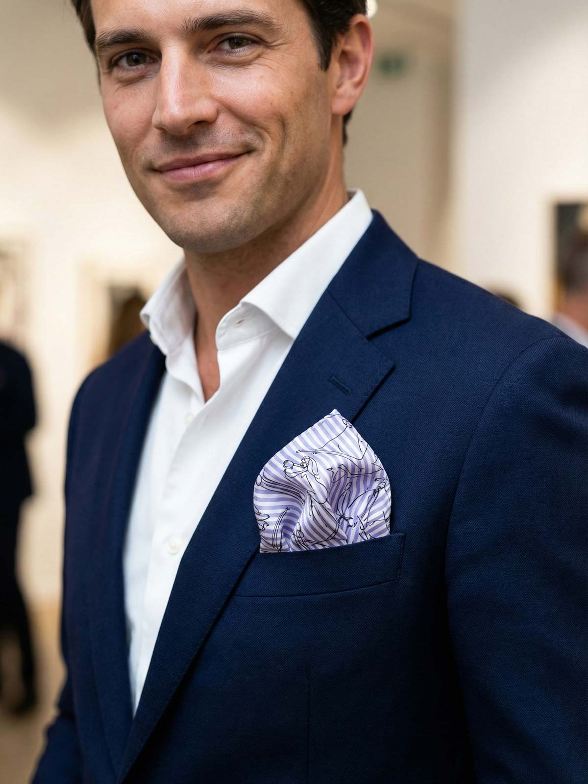 Kama Jacquard è ideale per chi vive l’eleganza con ironia intelligente, regalando al taschino un tocco artistico e conversazionale. Perfetta con blazer navy, grigio grafite o nero, porta con sé un’estetica contemporanea che non chiede permesso per farsi notare.