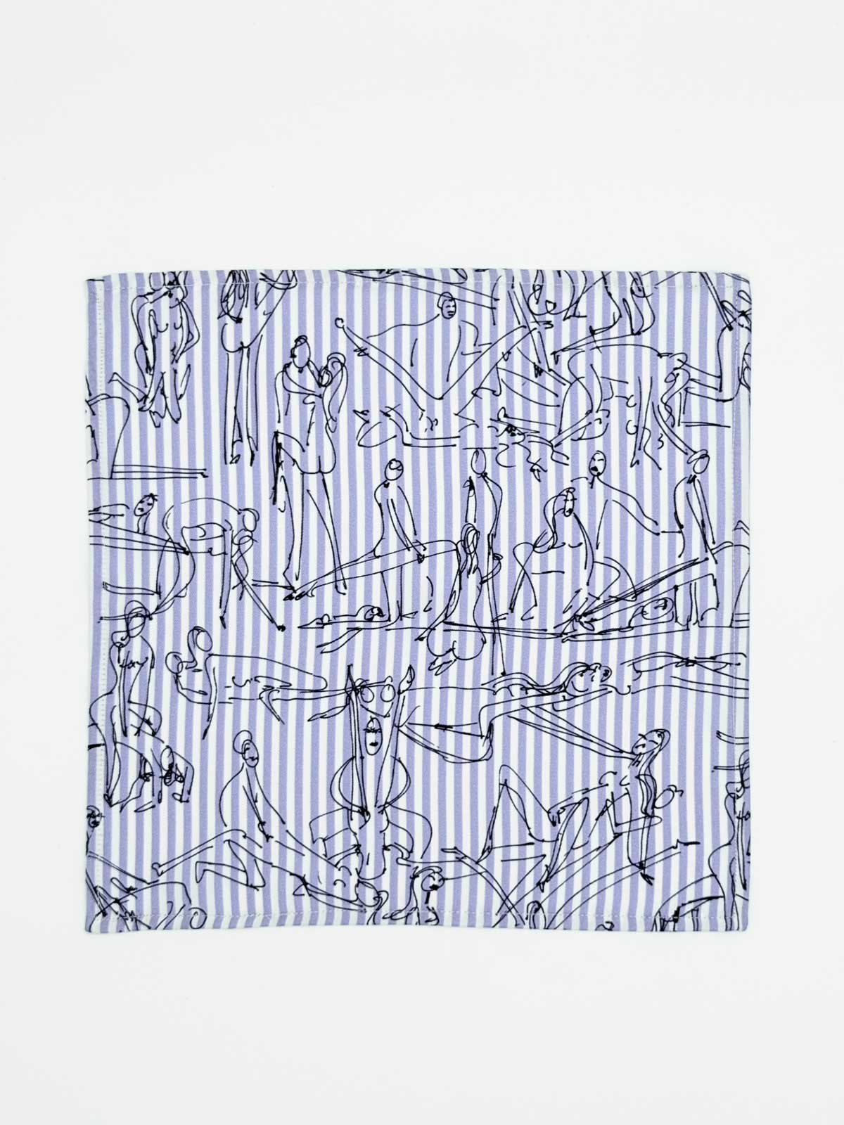 Il motivo nasce dall’unione tra un’elegante base a righe lavanda e il gioco grafico delle illustrazioni lineari ispirate alle posizioni del Kamasutra: una trama intrecciata che dà profondità al disegno, rendendolo raffinato, sorprendente e mai esplicito.