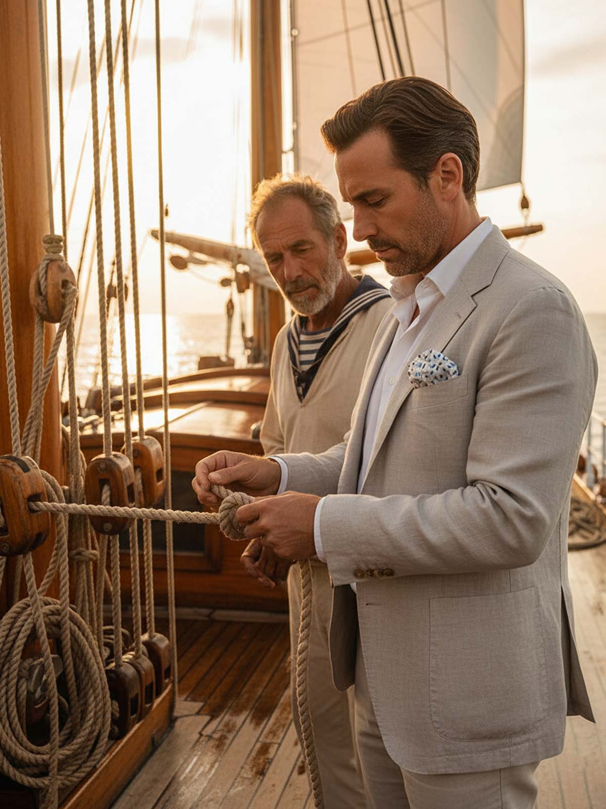 Micro-pattern marittimo (salvagenti, corde, boe) dallo stile mediterraneo, fresco, casual-elegante