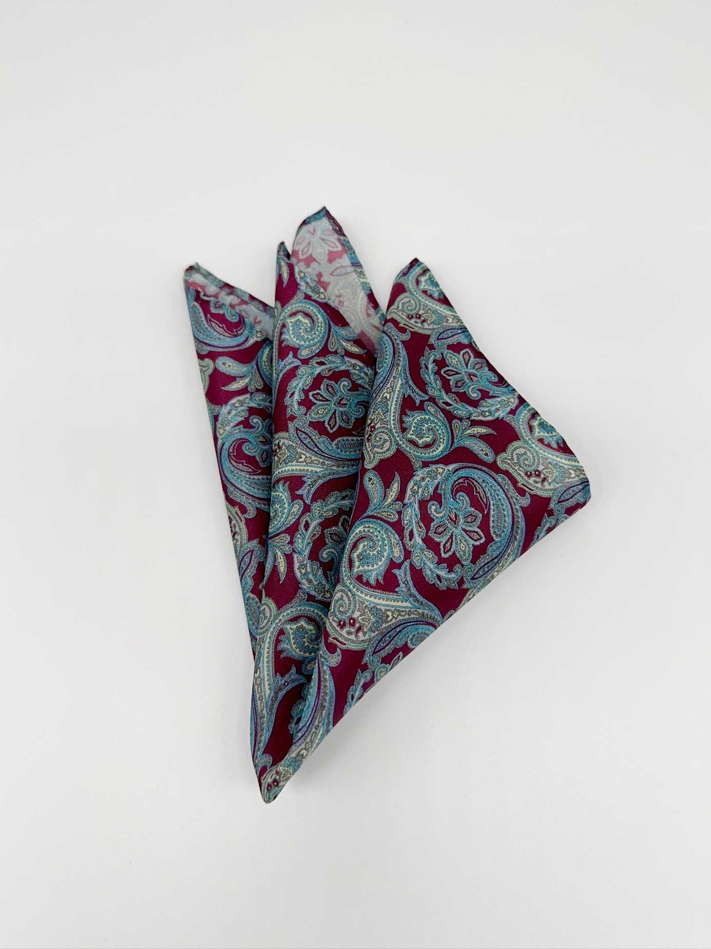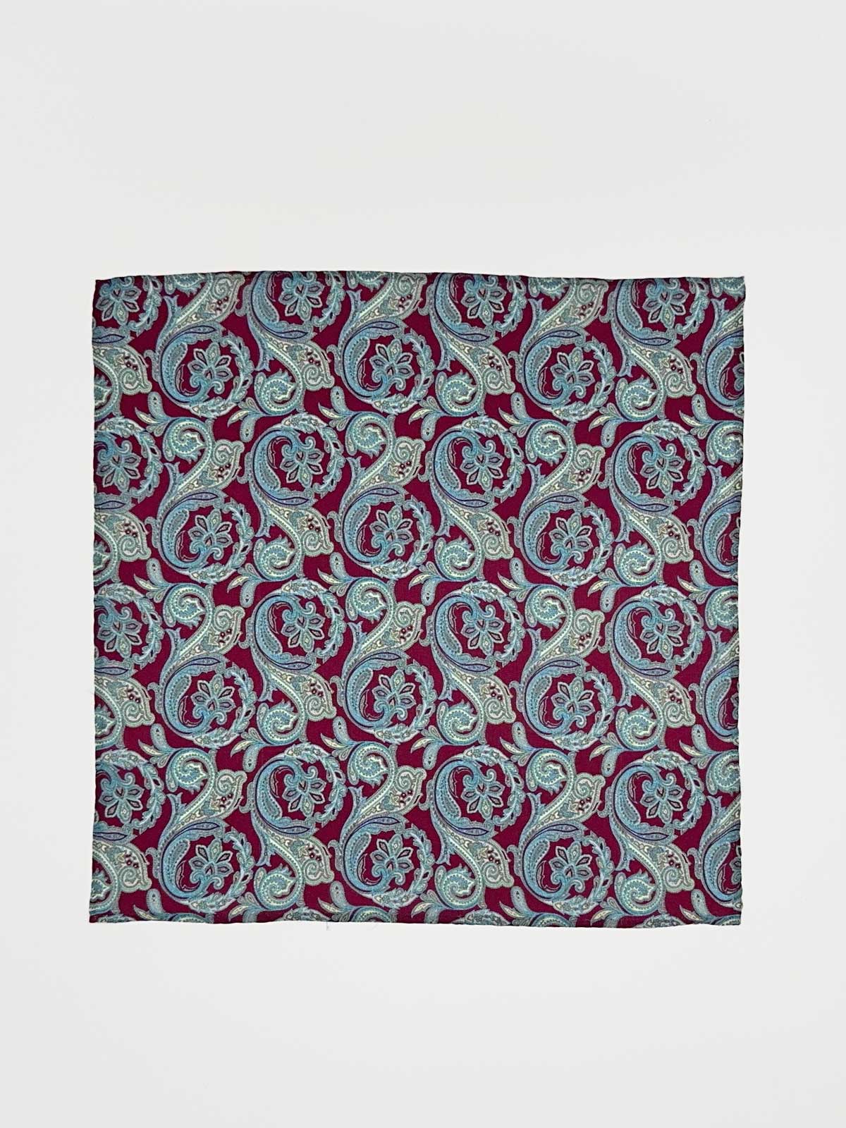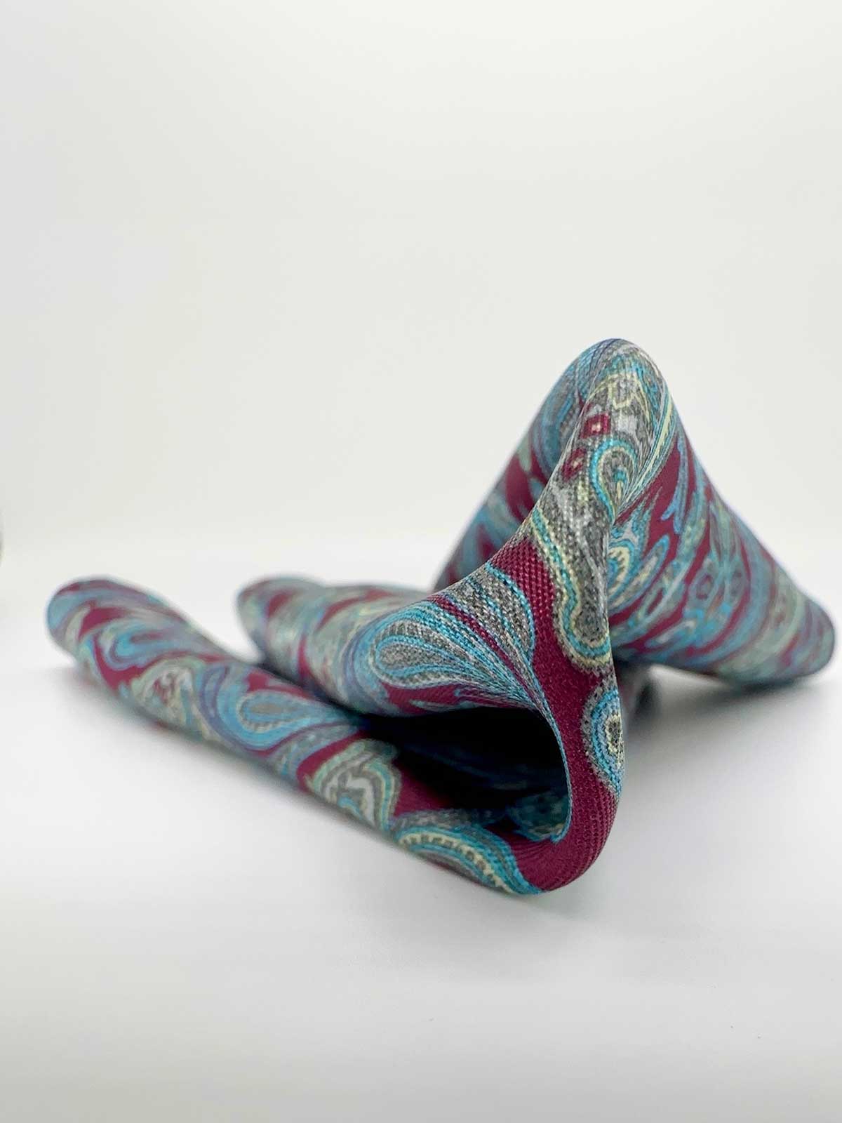 Il fondo rosso lampone โ profondo, elegante e ricco di personalitร โ si combina con un elaborato paisley nei toni del turchese, del petrolio e del grigio perla. Il risultato รจ un equilibrio raffinato tra tradizione e brillantezza contemporanea.