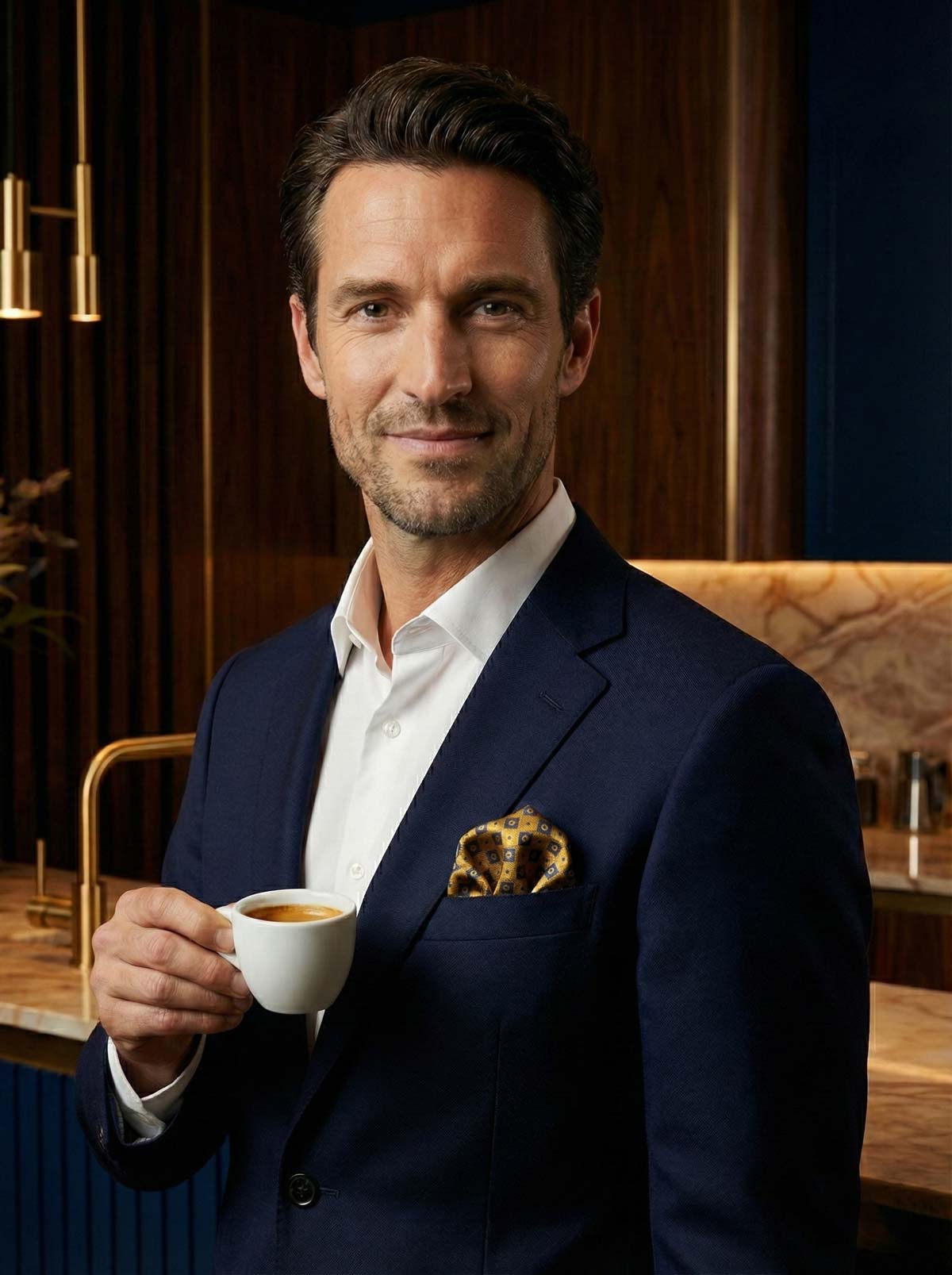 La pochette Lespresso Gold in pura seta jacquard รจ ciรฒ che succede quando lโeleganza incontraโฆ un caffรจ molto pregiato. Il motivo geometrico oro e blu dona ritmo e personalitร , con quella brillantezza tipica della jacquard che fa subito โuomo che sa scegliere beneโ.