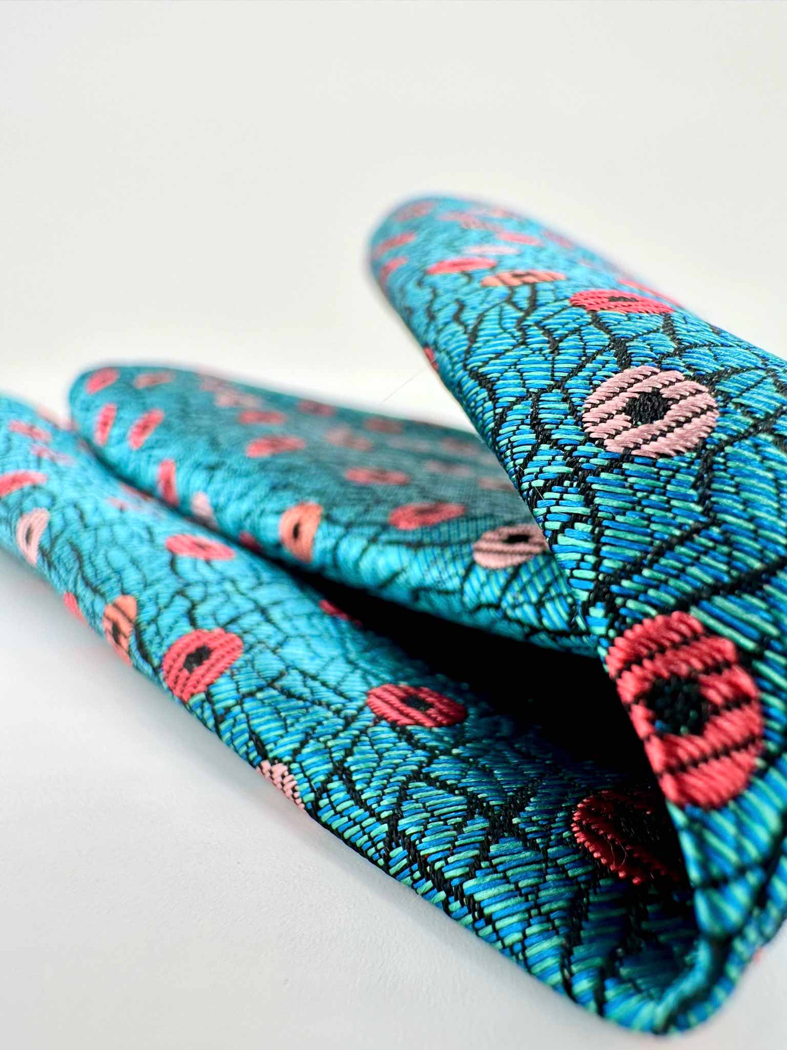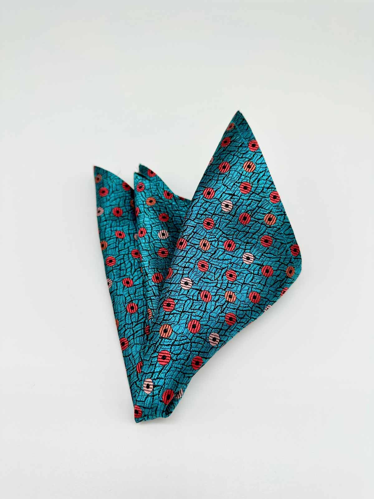Sisma Blue รจ la versione piรน fresca, vibrante e contemporanea della serie Sisma. Il fondo turchese profondo โ luminoso ma mai eccessivo โ si intreccia con un complesso motivo jacquard che ricorda una rete organica, quasi geologica, da cui emergono piccoli cerchi nei toni del rosso corallo e del rosa antico. Lโeffetto รจ dinamico e raffinato allo stesso tempo, come un micro-terremoto controllato di colore e texture.