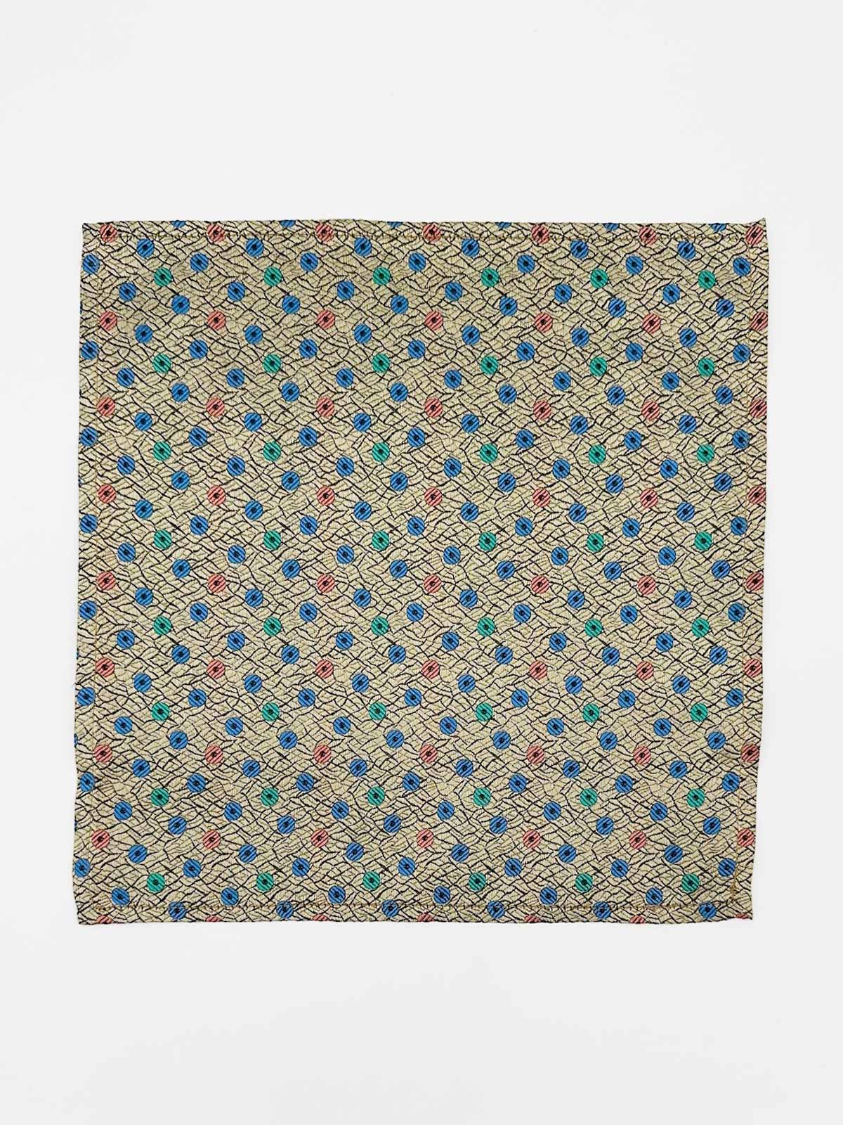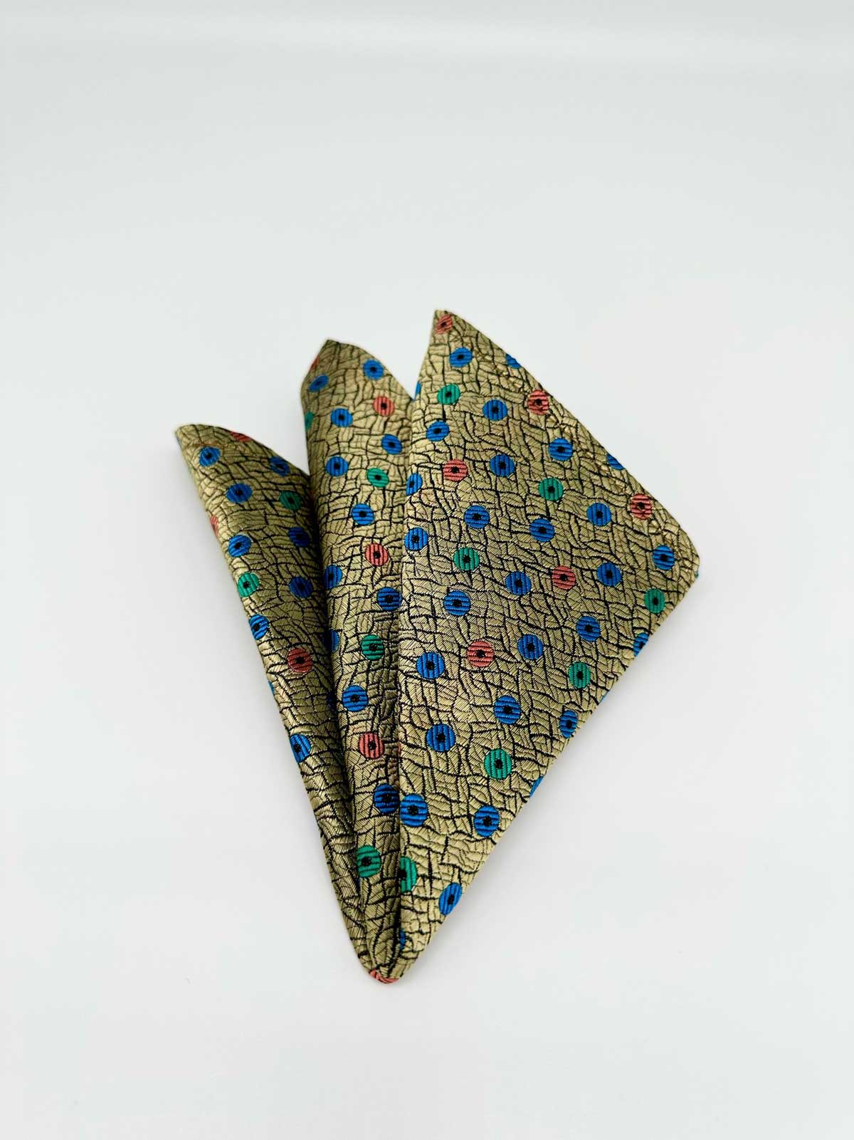 Il fondo oro chiaro, luminoso e caldo, si intreccia con un pattern grafico nero che richiama una trama quasi โsismicaโ, movimentata e vibrante. Su questa base ricca si appoggiano i micro-punti colorati โ blu, verde smeraldo e rosso corallo โ che aggiungono ritmo, carattere e un tocco di ironia raffinata.